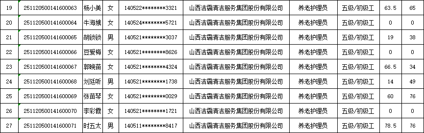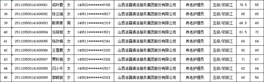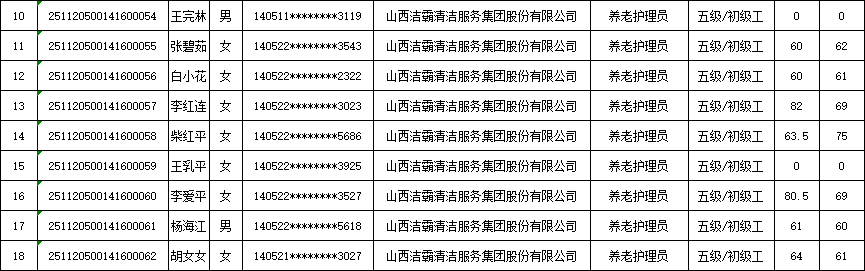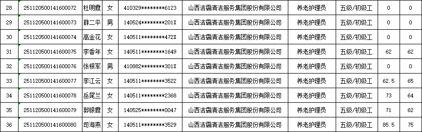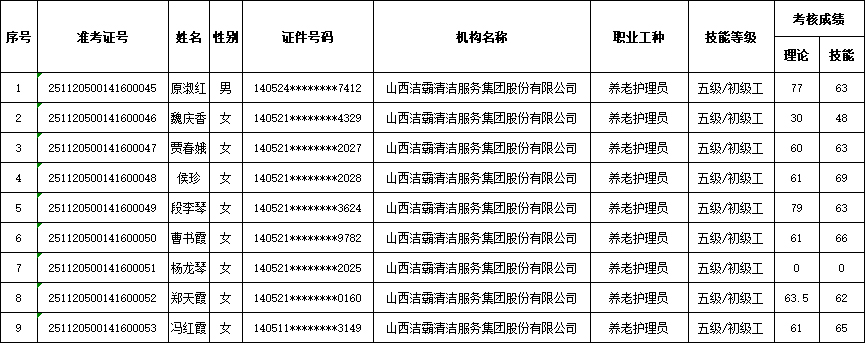 山西潔霸清潔服務(wù)集團(tuán)股份有限公司職業(yè)技能等級認(rèn)定中心2025年11月23日第5批養(yǎng)老護(hù)理員初級認(rèn)定人員成績公示
